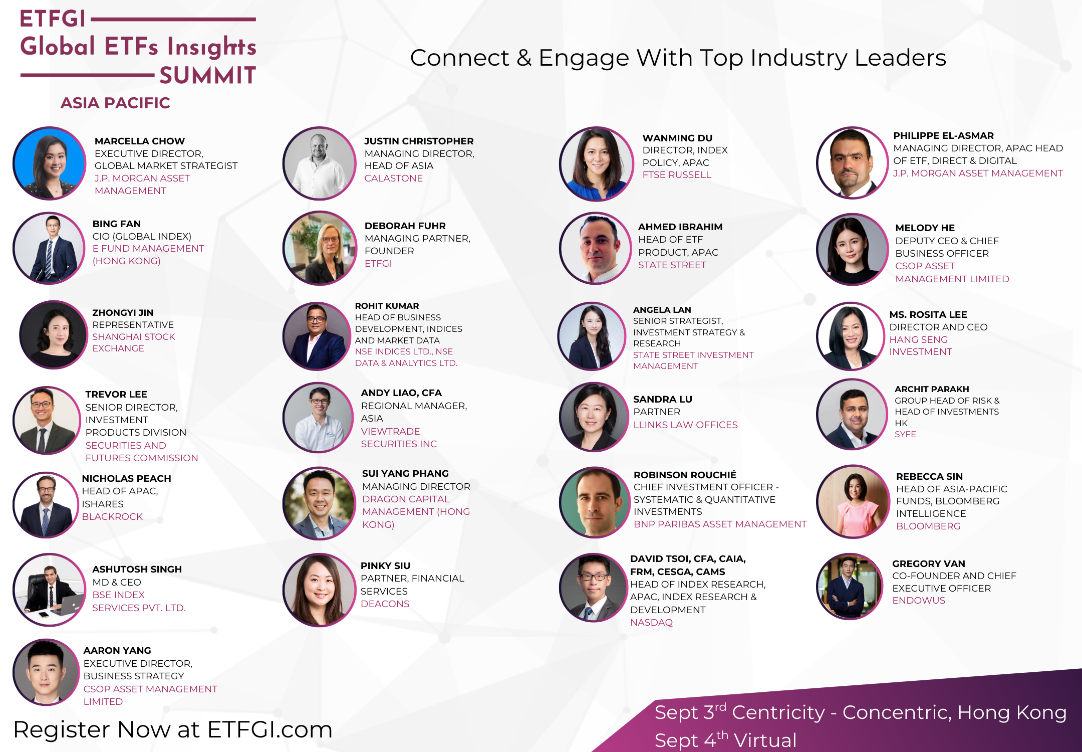 Don’t miss the opportunity to hear from and network with industry leaders from ETF issuers, regulators, investors, exchanges, trading firms across the ETFs markets in the Asia Pacific region as they share key insights and explore the trends driving the future of the ETF landscape.