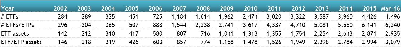 Assets invested in ETFs/ETPs listed globally have broken through the 3 trillion US dollars milestone for the second time at the end of Q1 2016, according to ETFGI