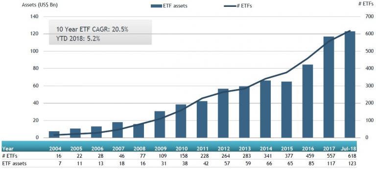 At the end of July 2018, the Canadian ETF/ETP industry had 618 ETFs/ETPs, with 741 listings, assets of $123 Bn, from 28 providers listed on 2 exchanges. Due to net inflows and market moves the assets invested in ETFs/ETPs listed in Canada increased by 2.84% during the month, from $120 Bn at the end of June 2018, and increased by 5.17% year-to-date from $117 Bn at the end of 2017.