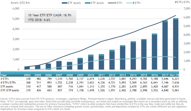 Growth in Global ETF and ETP assets as of the end of November 2018