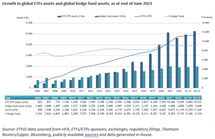 Growth in assets in the Global ETFs industry has outpaced growth in the hedge fund industry since the financial crisis in 2008. According to ETFGI’s analysis $10.51 trillion were invested in 11,439 ETFs/ETPs listed globally at the end of Q2 2023, representing an increase in assets of 6.56% over the quarter. Over the same period assets invested in hedge funds globally increased by 1.81%, to $3.95 trillion in 9,130 hedge funds, according to HFR.