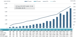 During August, ETFs gathered net inflows of $66.31 Bn. Equity ETFs gathered net inflows of $18.73 Bn in August, bringing YTD net inflows to $288.66 Bn, much higher than the YTD $120.78 Bn in net in 2023. Fixed income ETFs had net inflows of $25.61 Bn during August, bringing YTD net inflows to $129.54 Bn, higher than the YTD $109.87 Bn in net inflows in 2023. Commodities ETFs reported net inflows of $715.56 Mn during August, bringing YTD net outflows to $1.73 Bn, less than the $5.80 Bn in net outflows YTD in 2023. Active ETFs attracted net inflows of $20.67 Bn during the month, gathering YTD net inflows of $180.40 Bn, much higher than the $74.20 Bn in net inflows YTD in 2023.