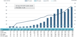 - YTD net inflows in 2024 of $9.80 Bn are ninth highest on record, while the highest recorded YTD net inflows are of $55.07 Bn in 2020, followed by YTD net inflows of $46.59 Bn in 2018 and YTD net inflows of $42.14 Bn in 2017.