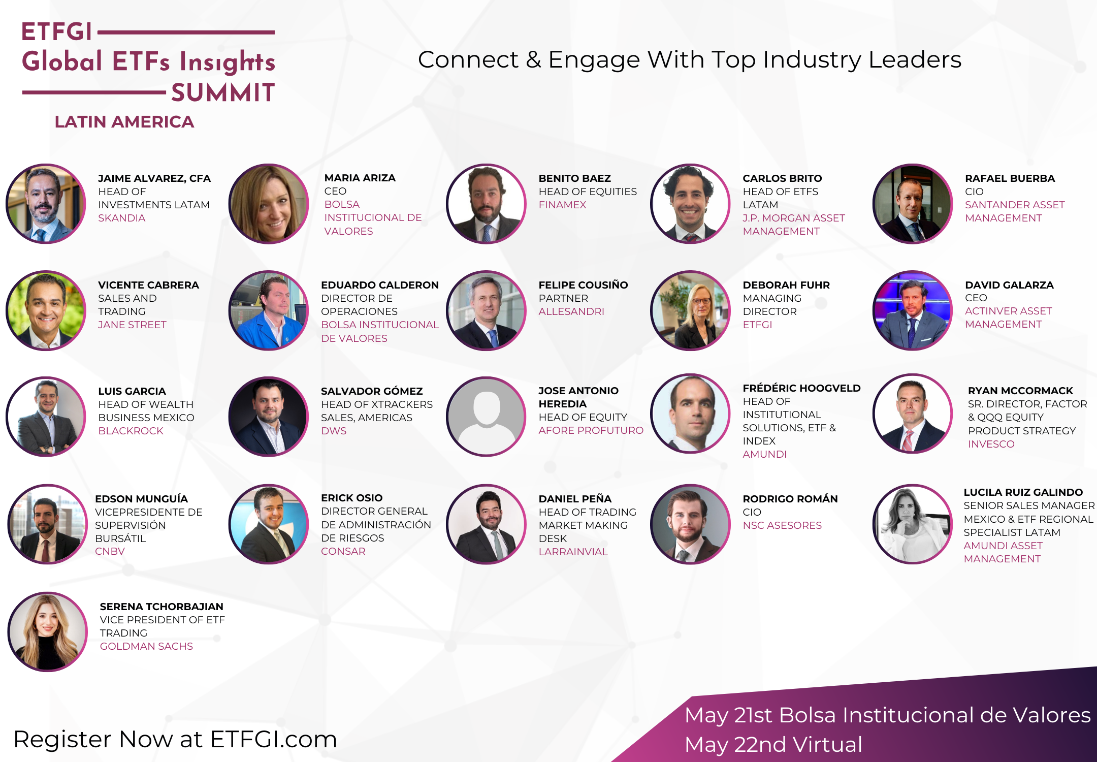 The summit is designed to be an educational event fostering discussions on the due diligence, selection, and trading of local, US and UCITS ETFs by financial advisors and institutional investors in Mexico, Chile, Peru, Colombia, Brazil and Argentina. Hear from industry leaders from ETF issuers, regulators, investors, exchanges, and trading firms who will share insights on product development, regulations, trading practices, and technological advancements shaping ETF innovation and usage.