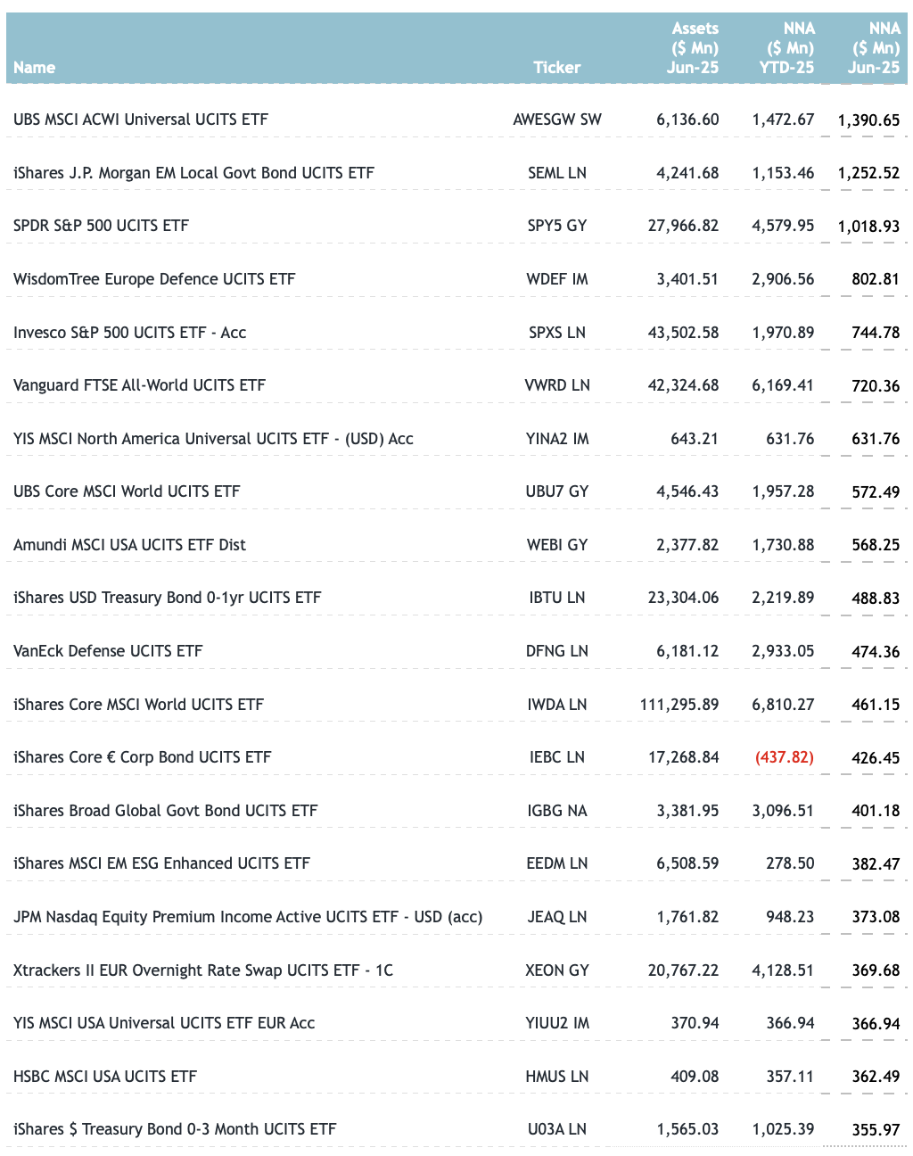 Substantial inflows can be attributed to the top 20 ETFs by net new assets, which collectively gathered $12.17 Bn in June. UBS MSCI ACWI Universal UCITS ETF (AWESGW SW) gathered $1.39 Bn, the largest individual net inflow.
