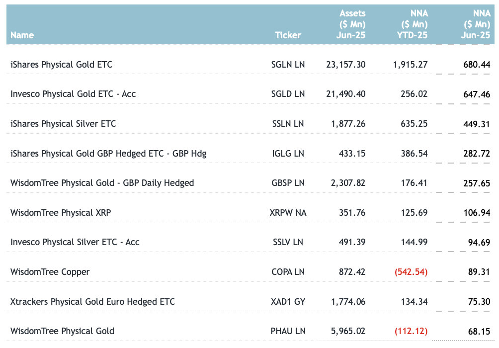 The top 10 ETPs by net new assets collectively gathered $2.75 Bn during June. iShares Physical Gold ETC (SGLN LN) gathered $680.44 Mn, the largest individual net inflow.