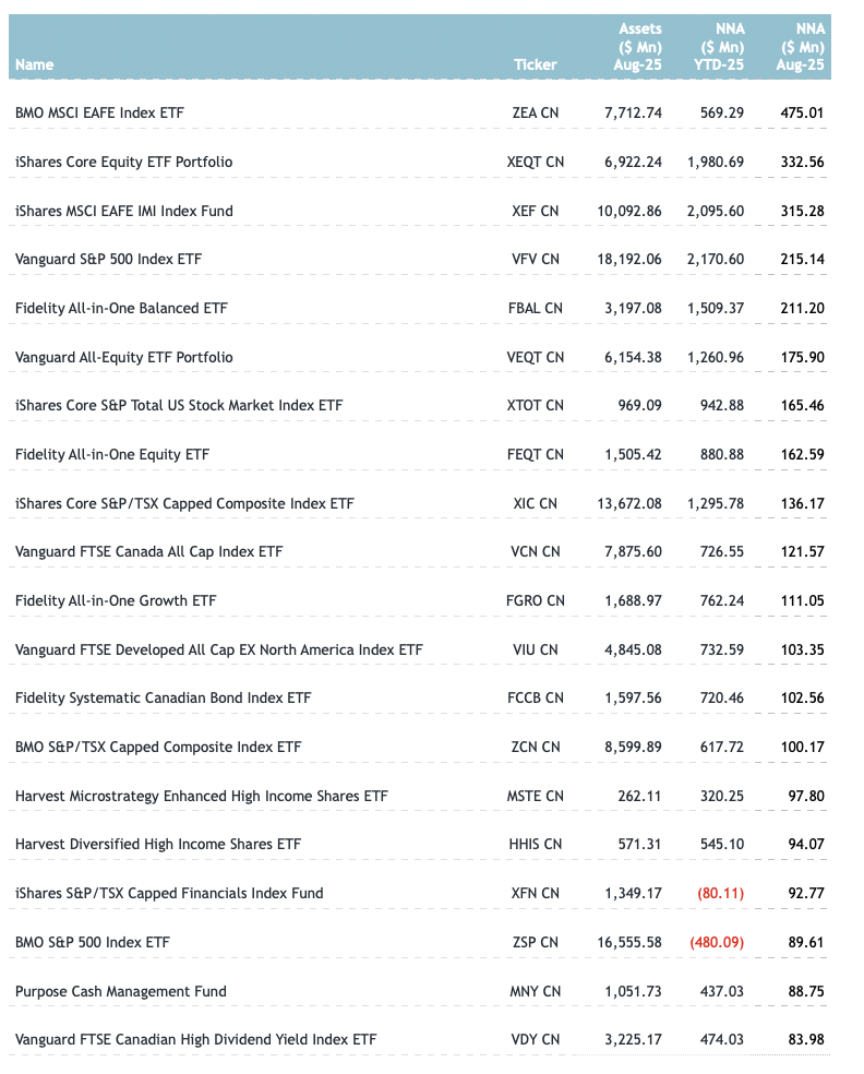 Top 20 ETFs by net new assets August 2025: Canada