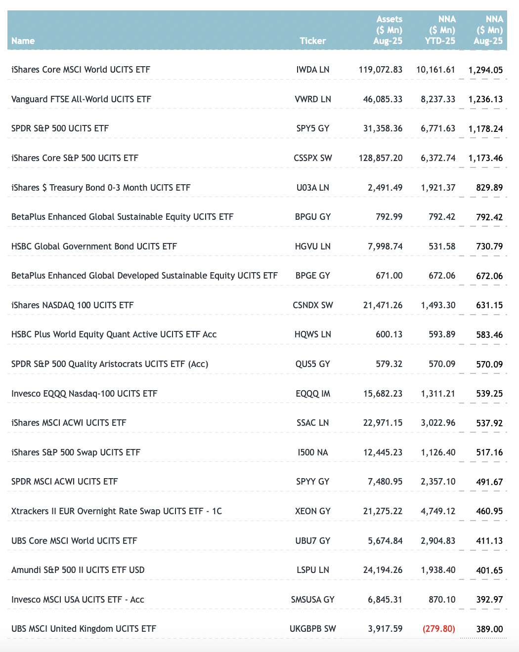 Substantial inflows can be attributed to the top 20 ETFs by net new assets, which collectively gathered $13.83 Bn in August. iShares Core MSCI World UCITS ETF (IWDA LN) gathered $1.29 Bn, the largest individual net inflow.