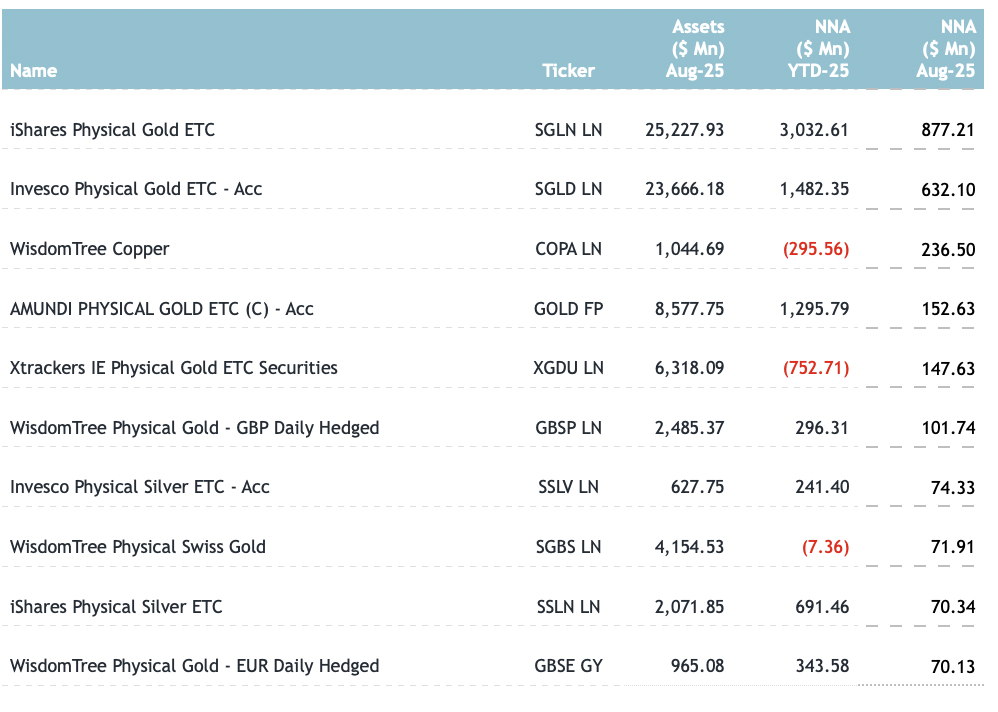 The top 10 ETPs by net new assets collectively gathered $2.43 Bn during August. iShares Physical Gold ETC (SGLN LN) gathered $877.21 Mn, the largest individual net inflow.